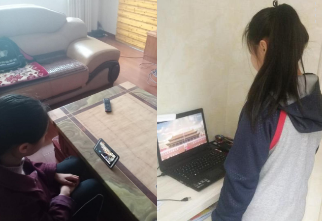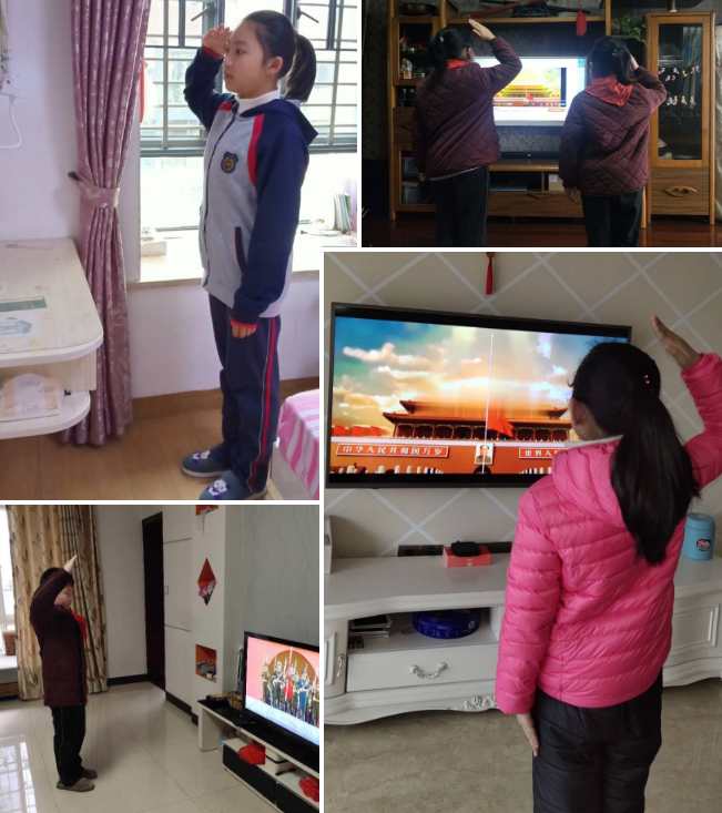 一個個穿戴整齊的同學們,他們胸前佩戴紅領巾在家中面向直播中的國旗肅立,聽指揮高唱國歌,少年隊員敬隊禮。立下凌云志,致敬逆行者,當好接班人。